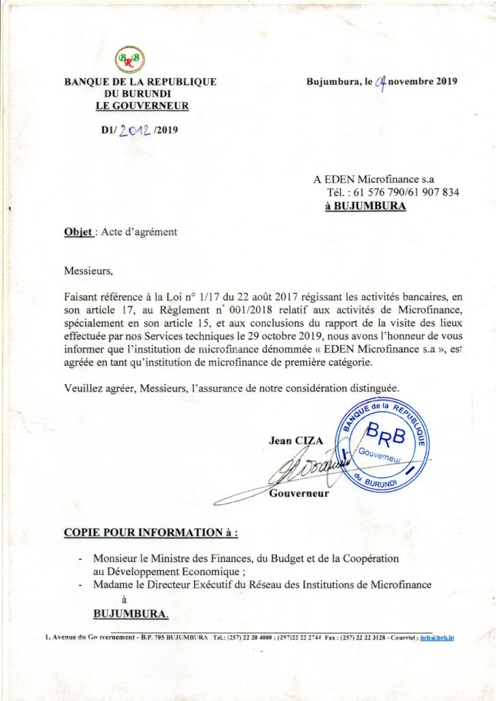 Le 4 novembre 2019, Eden Microfinance s.a franchi une étape décisive en obtenant son agrément officiel de la Banque de la République du Burundi, marquant le démarrage légal de ses activités.